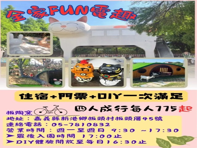 2.板陶窯門票乙張(門票依住房人數提供,最多可四位入園),每張內含虎爺彩繪公仔DIY一份及貓咪平面彩繪DIY一份。( 價值NT$950 )