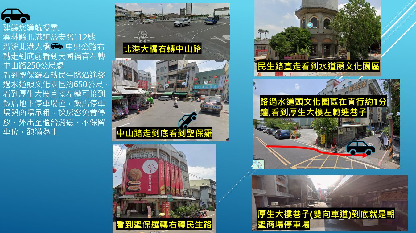 手機導航 雲林縣北港鎮益安路112號 即可抵達 商場地下停車場 ,飯店櫃檯在商場四樓